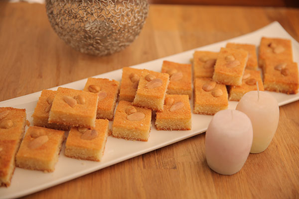 - 6. باستعمال سكين مبلله بالماء قطعي البسبوسة إلى مربعات ثم ضعي أنصاف البندق واللوز على سطح البسبوسة.